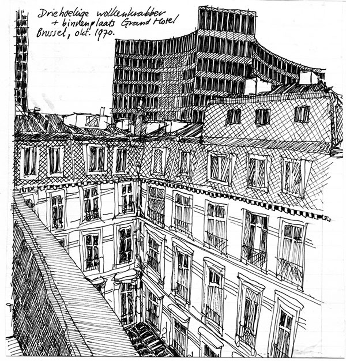 (1 oktober 1970)Uitzicht uit een kamer van het Grand Hotel, Anspachlaan, Brussel, met uitzicht op de ‘hoofdzetel’ van BPost.
