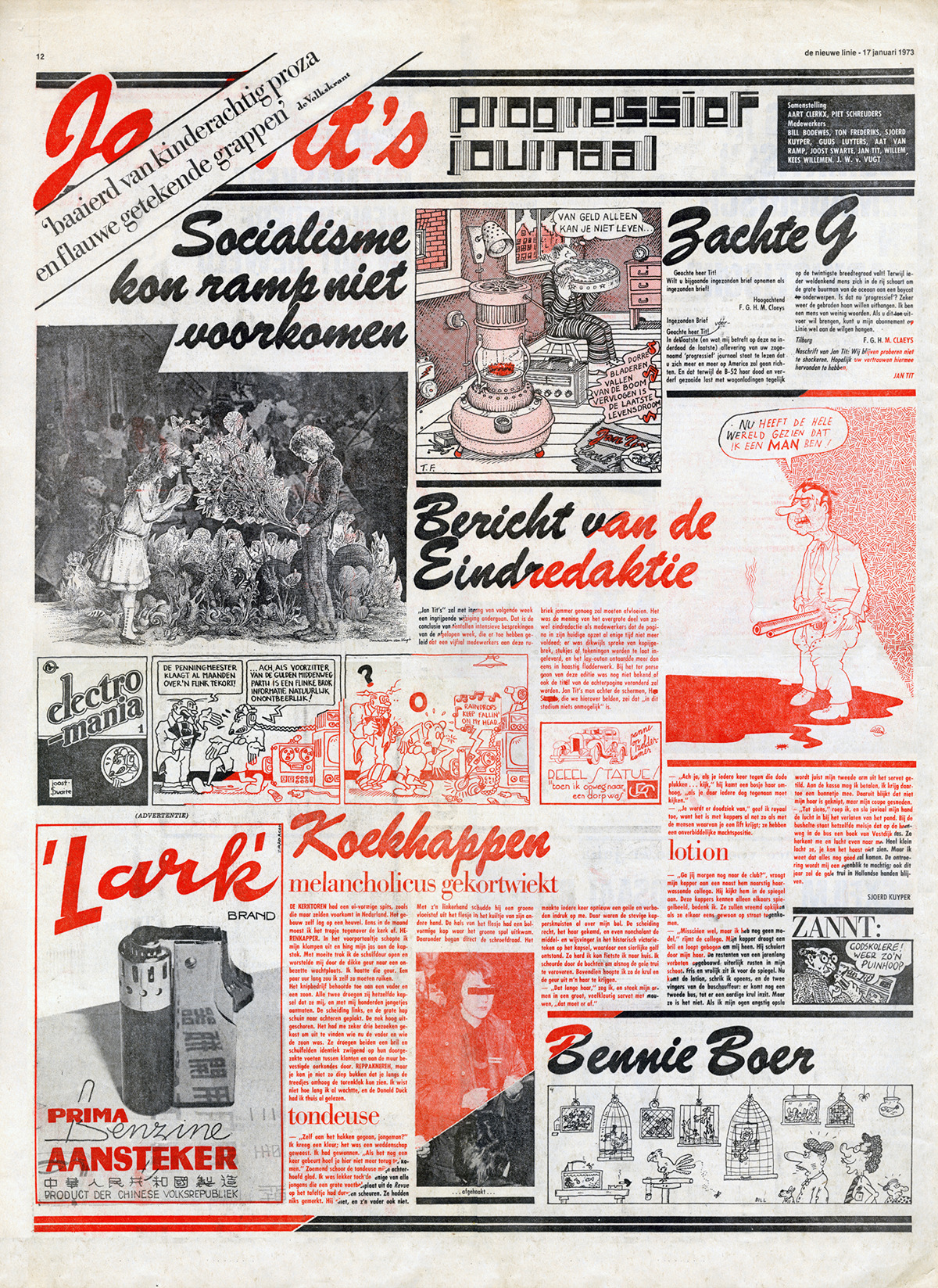 (18 mei 1973)Opmaak en redactie (met Aart Clerkx) van een rubriek op de achterpagina van De Nieuwe Linie, verschenen op 17 januari resp. 23 mei 1973. Medewerkers: Bill Bodéwes, Ton Frederiks, Sjoerd Kuyper, Guus Luyters, Joost Swarte, Willem, Kees Willemen en Jan Willem van Vugt.
