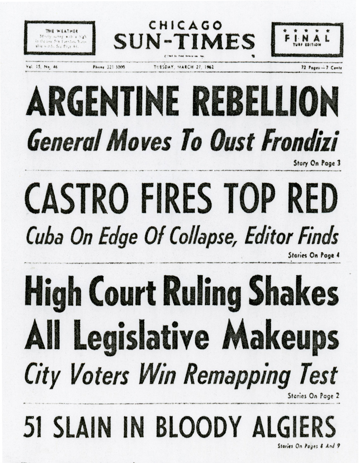 (25 november 1974)Omslagontwerp De Poezenkrant #13-14, kerstmis 1974. Opmaak gebaseerd op een voorpagina van de Chicago Sun-Times van 27 maart 1962.