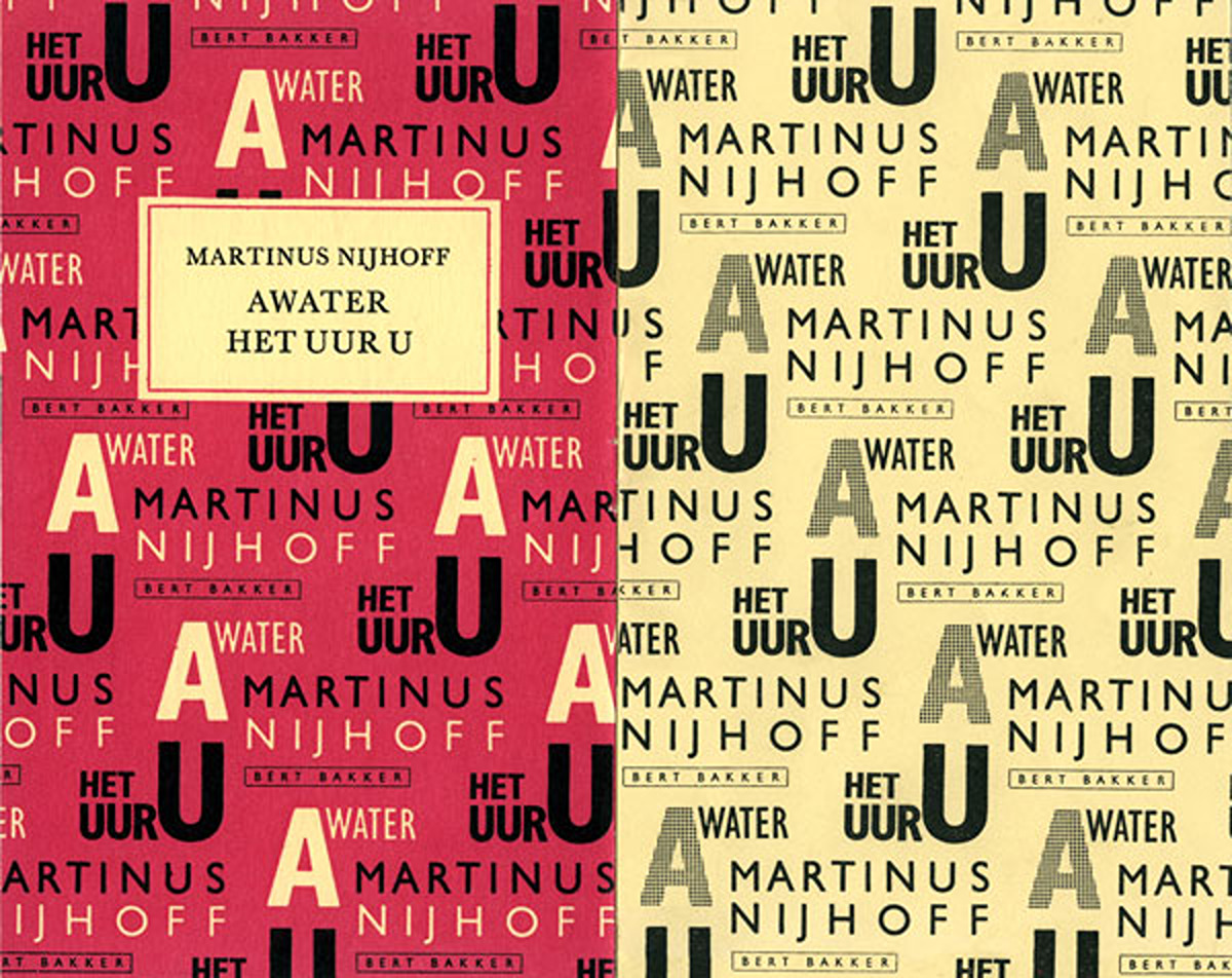 (1 januari 1977)Schutbladen van dichtbundel Awater / Het uur U van Martinus Nijhoff (Uitgeverij Bert Bakker, 1977).