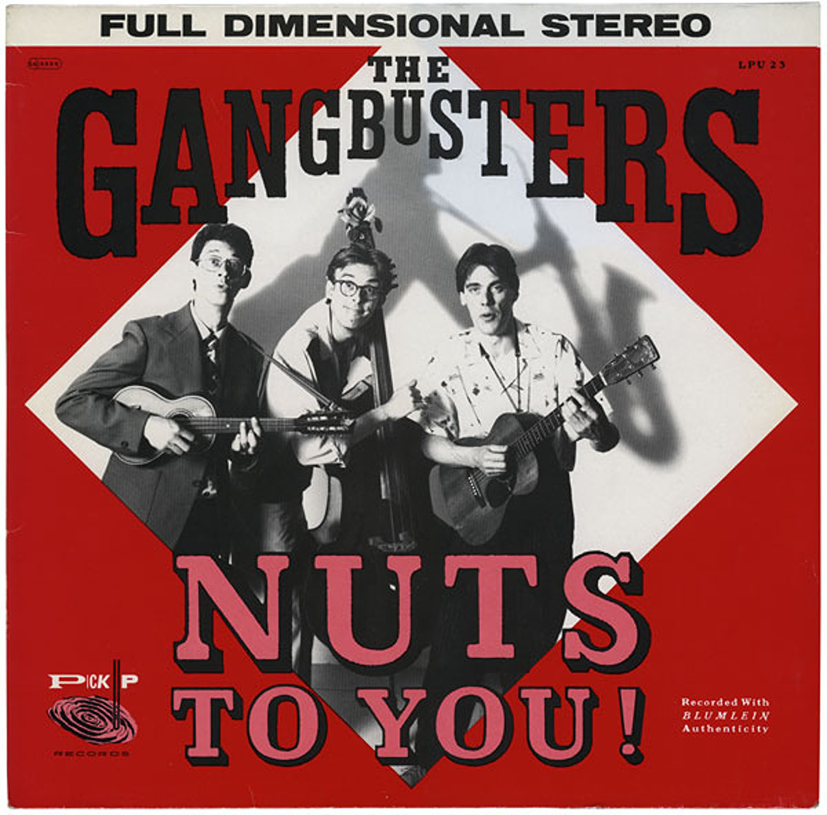 (18 juli 1985)Hoes voor de eerste lp van Gangbusters (Ton van Bergeijk, Gert-Jan Blom en Frènk van Meeteren). Uitgave Pick-Up Records (1985). ‘Recorded with BLUMLEIN authenticity’