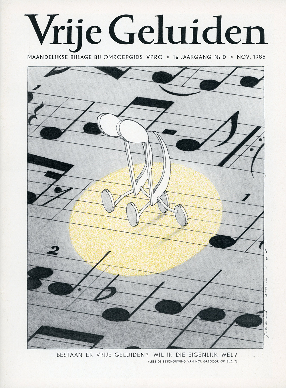 (25 oktober 1985)Nulnummer van Vrije Geluiden, beoogd maandblad voor leden van Omroepvereniging VPRO, november 1985. Bevat bijdragen van Jan Blokker, Fiep Westendorp, Nol Gregoor, Hugo Kaagman, J.P. Guépin, Garrison Keillor, Hans Dulfer, P. Aalbers, Piet Schreuders, Hans Vervoort, Wim Wennekes, Aart Clerkx, Tieke Spelberg (= Wim Noordhoek), Peter Pontiac, Fran van der Hoeven, Remco Campert, Gert-Jan Blom, Kees van Kooten en Piet Grijs (= Hugo Brandt Corstius).