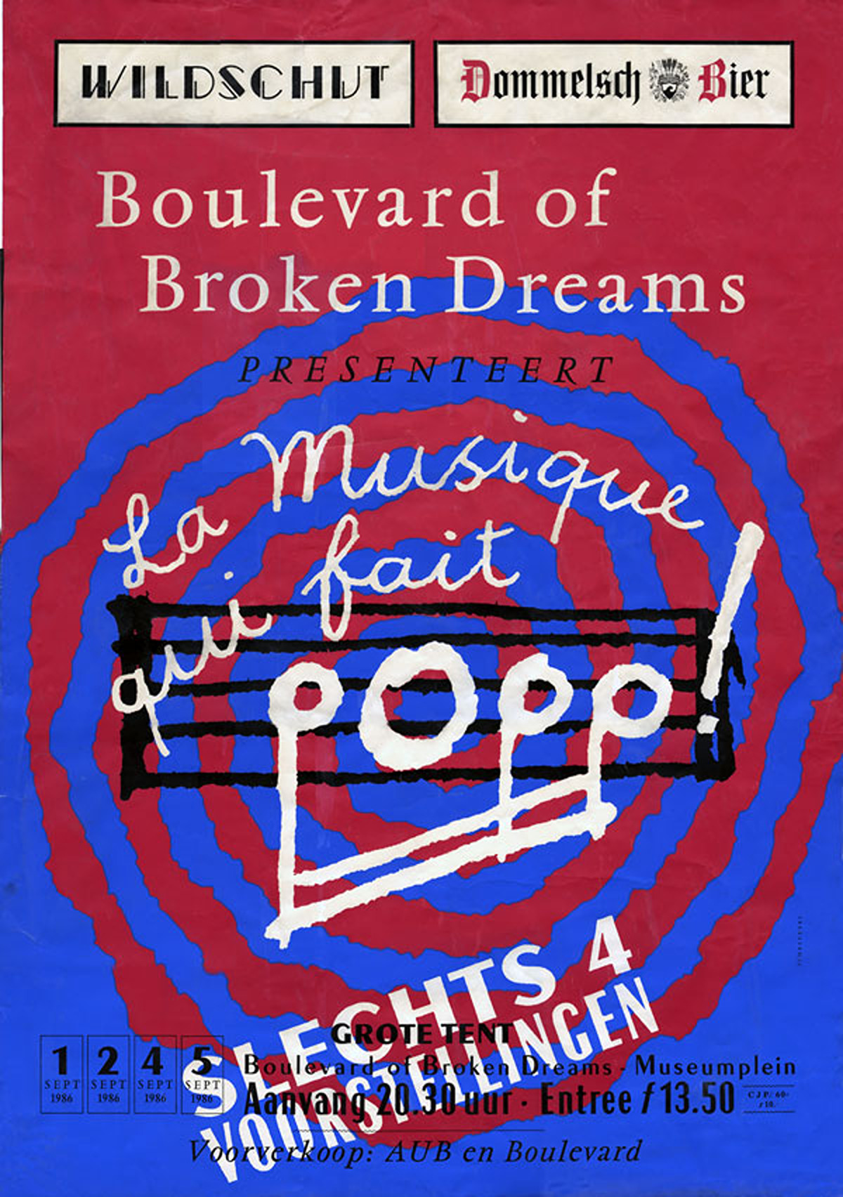 (15 augustus 1986)Affiche voor reeks concerten met muziek van André Popp, gemaakt in samenwerking met Rhonald Blommestijn en Gielijn Escher.