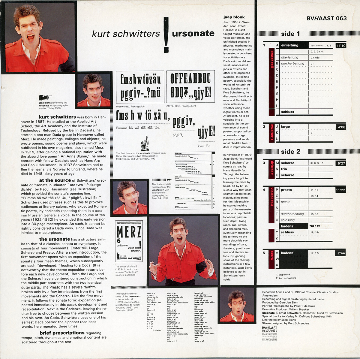 (6 juni 1986)Achterkant van een lp van Kurt Schwitters’ Ursonate in de uitvoering van Jaap Blonk, uitgegeven door BVHaast, 1986 (op last van de rechthebbenden van Schwitters’ werk uit de handel genomen). De letters fmsbwtözäu vormden in 1921 het uitgangspunt voor Schwitters’ klankdicht.