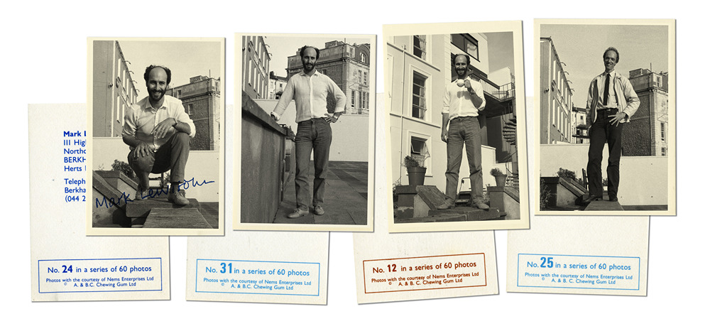 (6 september 1986)Visitekaartjes voor Mark Lewisohn en Piet Schreuders, naar voorbeeld van de Beatles-kauwgomplaatjes van de A. & B.C. Chewing Gum Company (1963). Foto's genomen in Weston-super-Mare