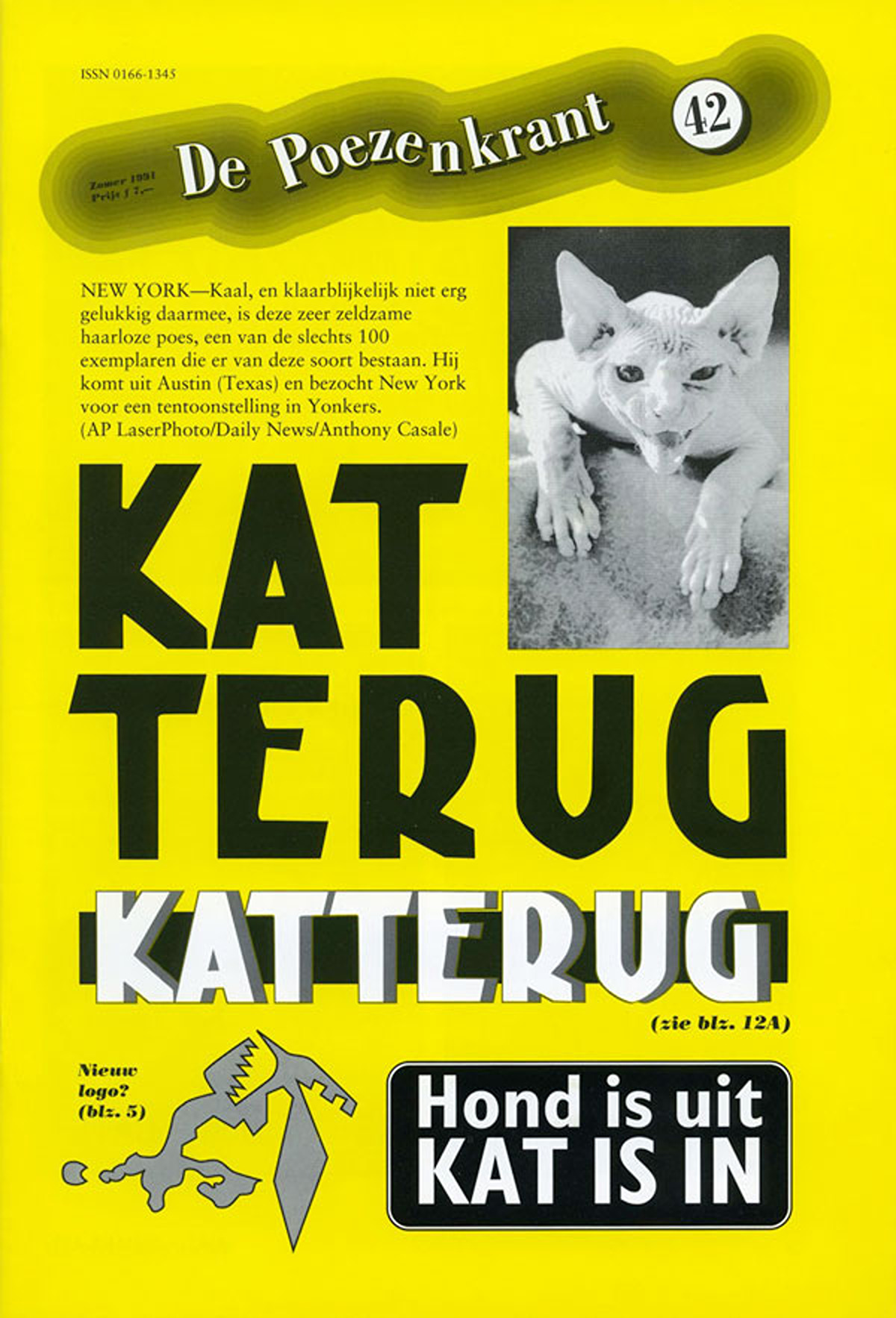 (27 mei 1991)Voorpagina De Poezenkrant #42 (zomer 1991), met letters gebaseerd op de Amsterdamse ‘bruggenletter’, toegeschreven aan Anton Kurvers.