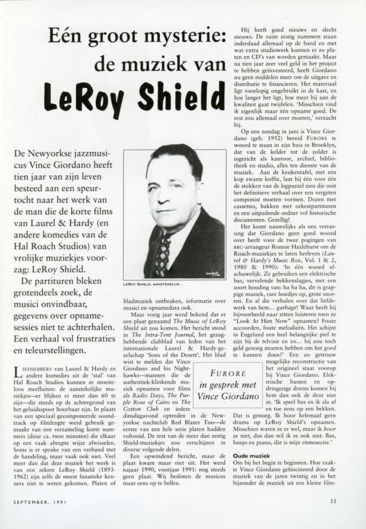 (13 augustus 1991)Interview met Vince Giordano over diens zoektocht naar de muziek van LeRoy Shield, in Furore #17 (september 1991).