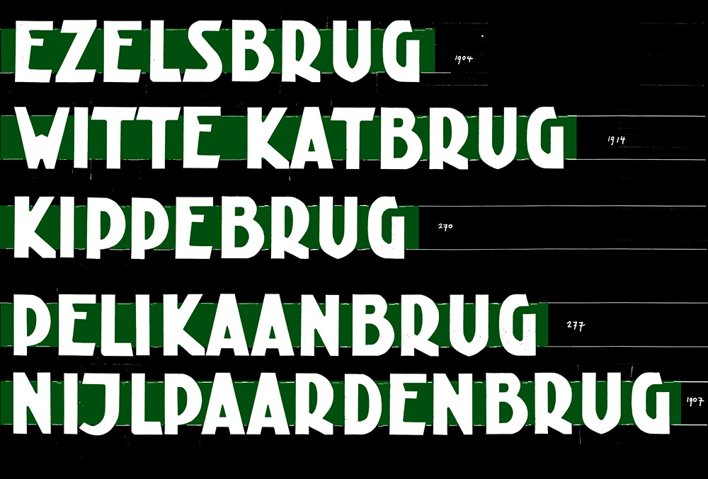 (6 oktober 1992)Voorbeelden voor de spatiëring van naamborden op Amsterdamse bruggen, in opdracht van de Dienst Onderhoud Bruggen, tussen 1991 en 1998