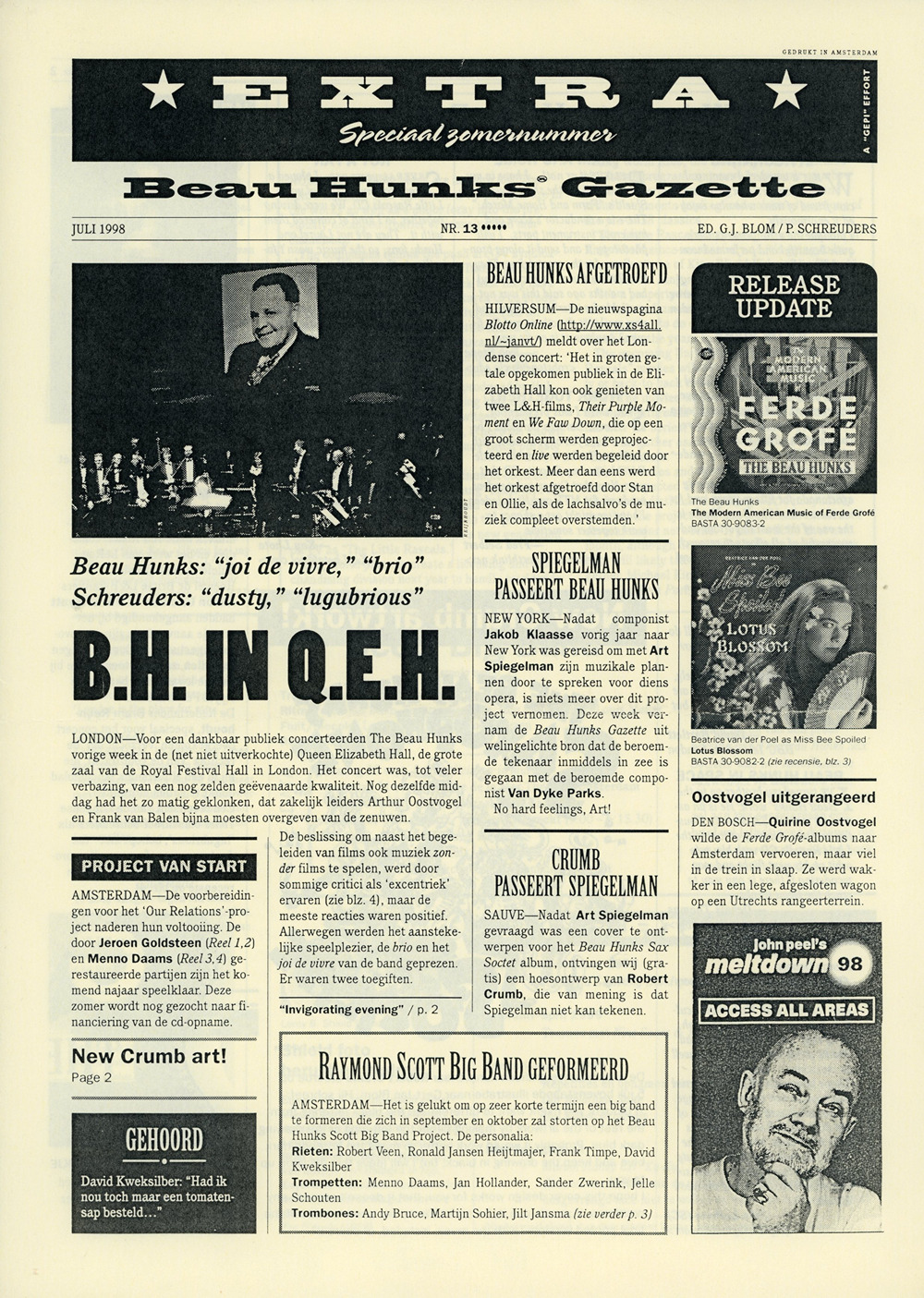(10 juli 1998)Aflevering 13 van nieuwsbrief The Beau Hunks Gazette naar aanleiding van het concert van The Beau Hunks in de Queen Elizabeth Hall in Londen, een onderdeel van het Meltdown Festival gecureerd door John Peel.