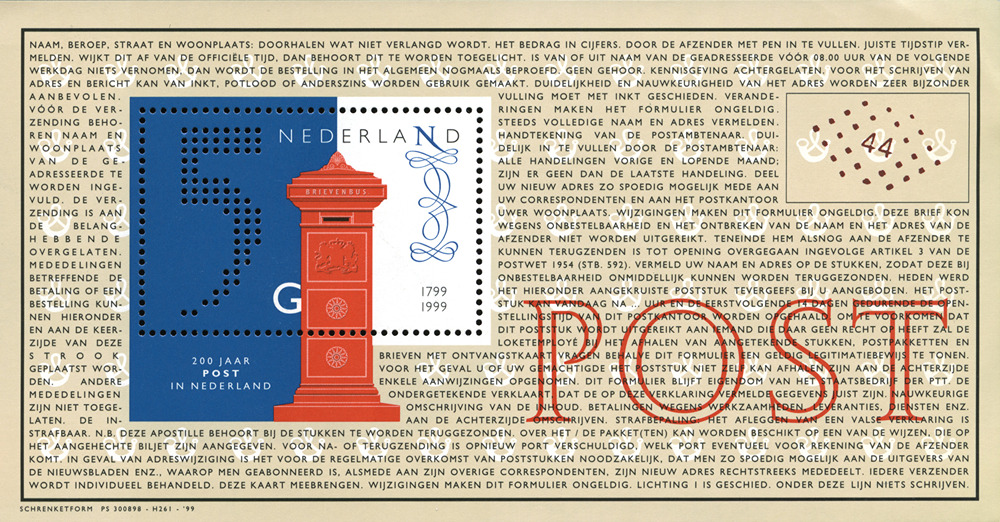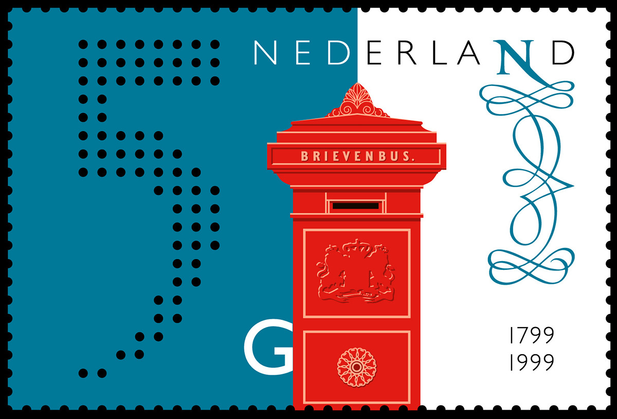 (8 september 1998)Ontwerp postzegelvel voor ‘200 jaar post in Nederland 1799-1999’ (PTT Post, 1999). Het cijfer 5 bestaat uit perforatiegaatjes. De ‘N’ is afkomstig van de cijferzegels van Jan van Krimpen.