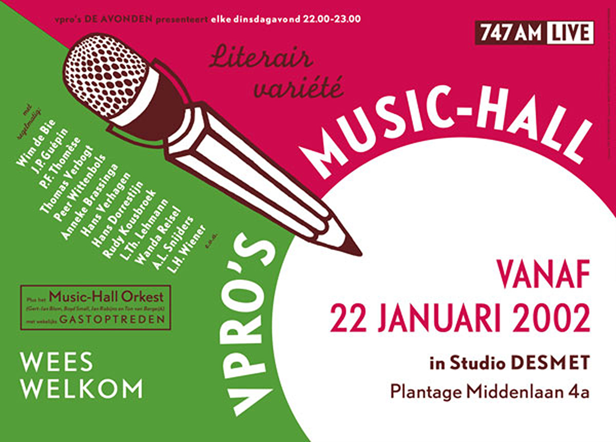 (6 januari 2002)Poster voor het literair variété Music-Hall, elke dinsdagavond in VPRO’s De Avonden. Met illustratie door Bart Rouwhorst (Studio Ron van Roon)