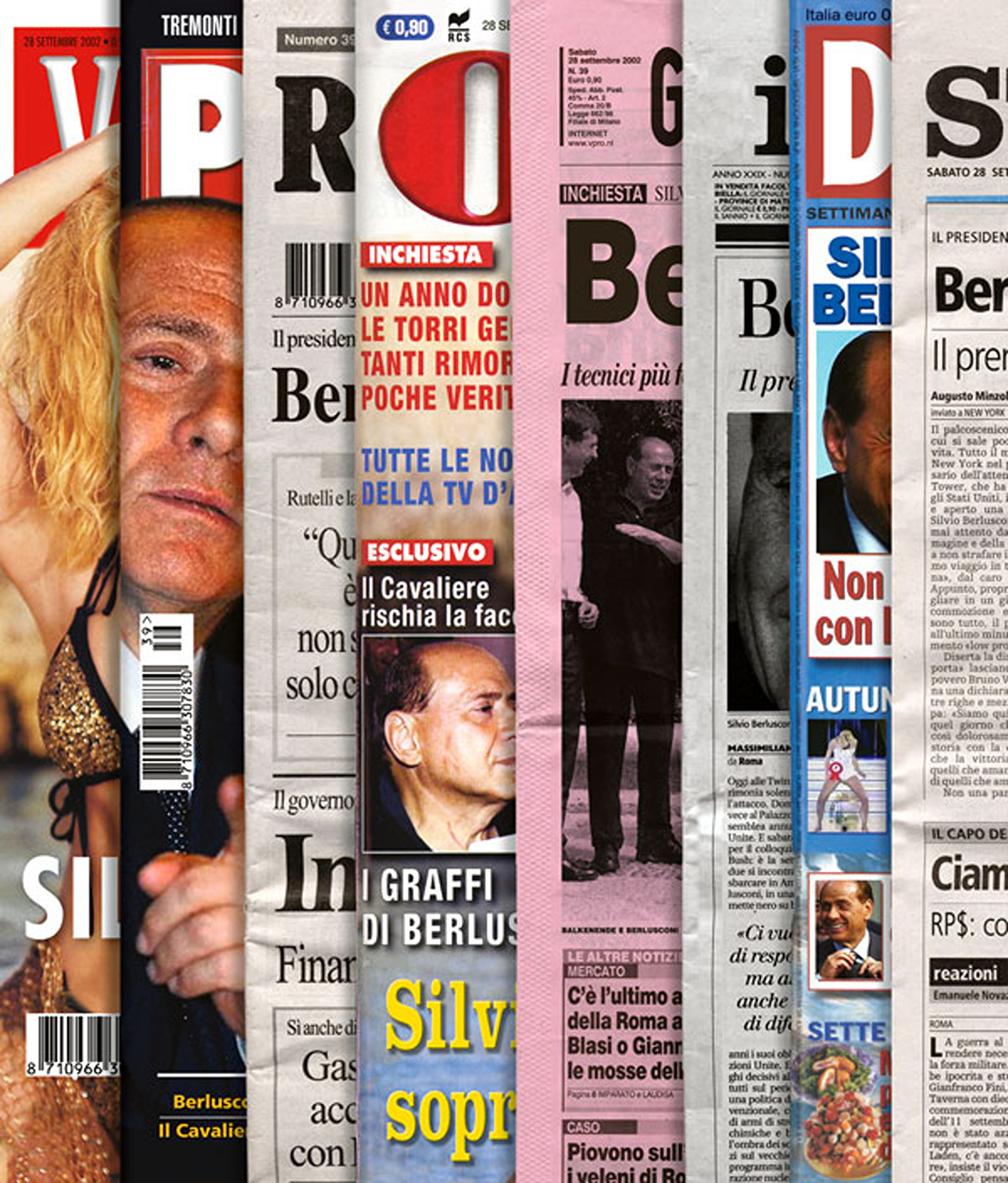 (16 september 2002)Collage samengesteld uit Italiaanse kranten en tijdschriften. Omslag voor VPRO Gids #39 (30 september 2002) met artikel over de politicus Silvio Berlusconi.