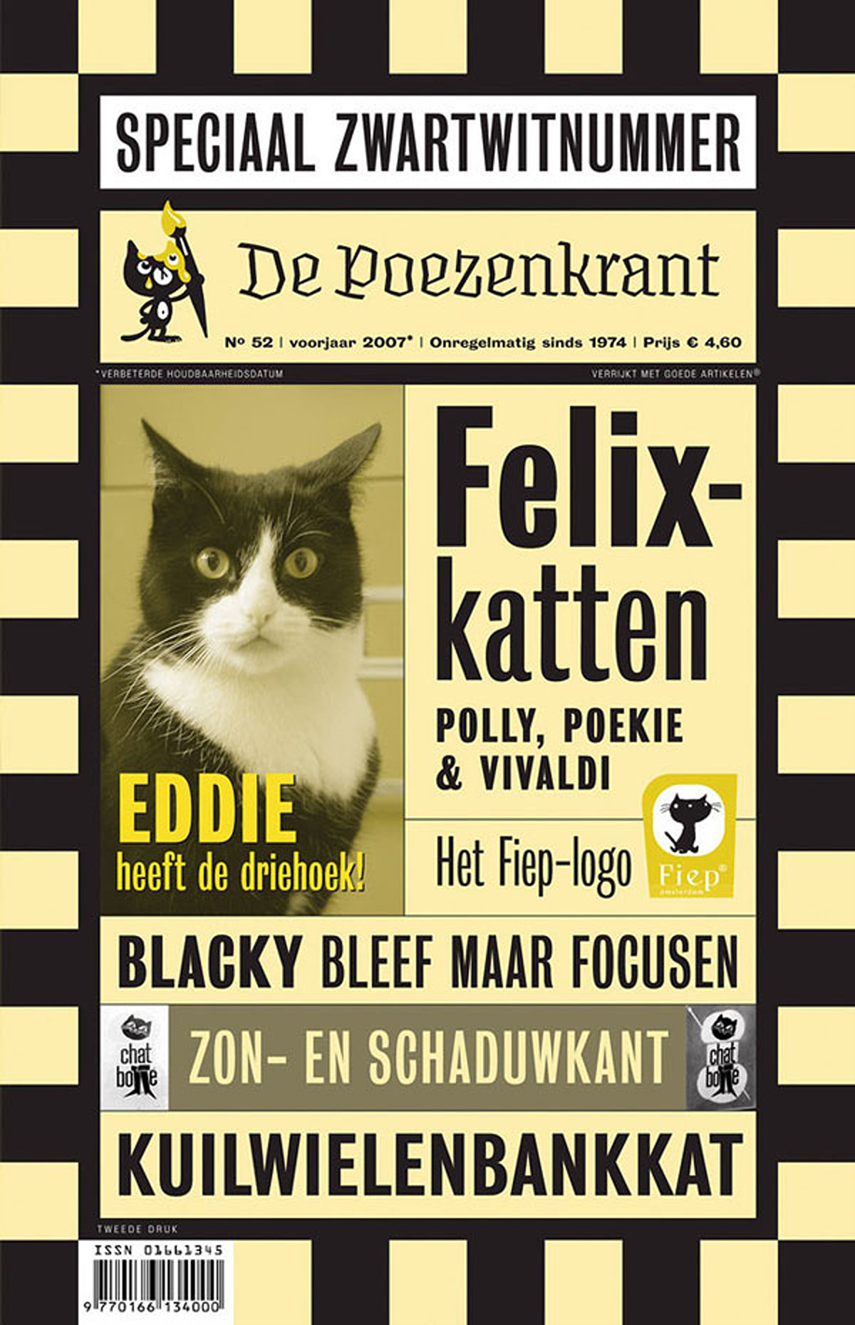 (6 december 2006)Voorpagina De Poezenkrant #52 (Speciaal zwart-wit nummer), geheel gedrukt in de kleuren zwart en geel. Foto EDDIE: Roel Siebrand