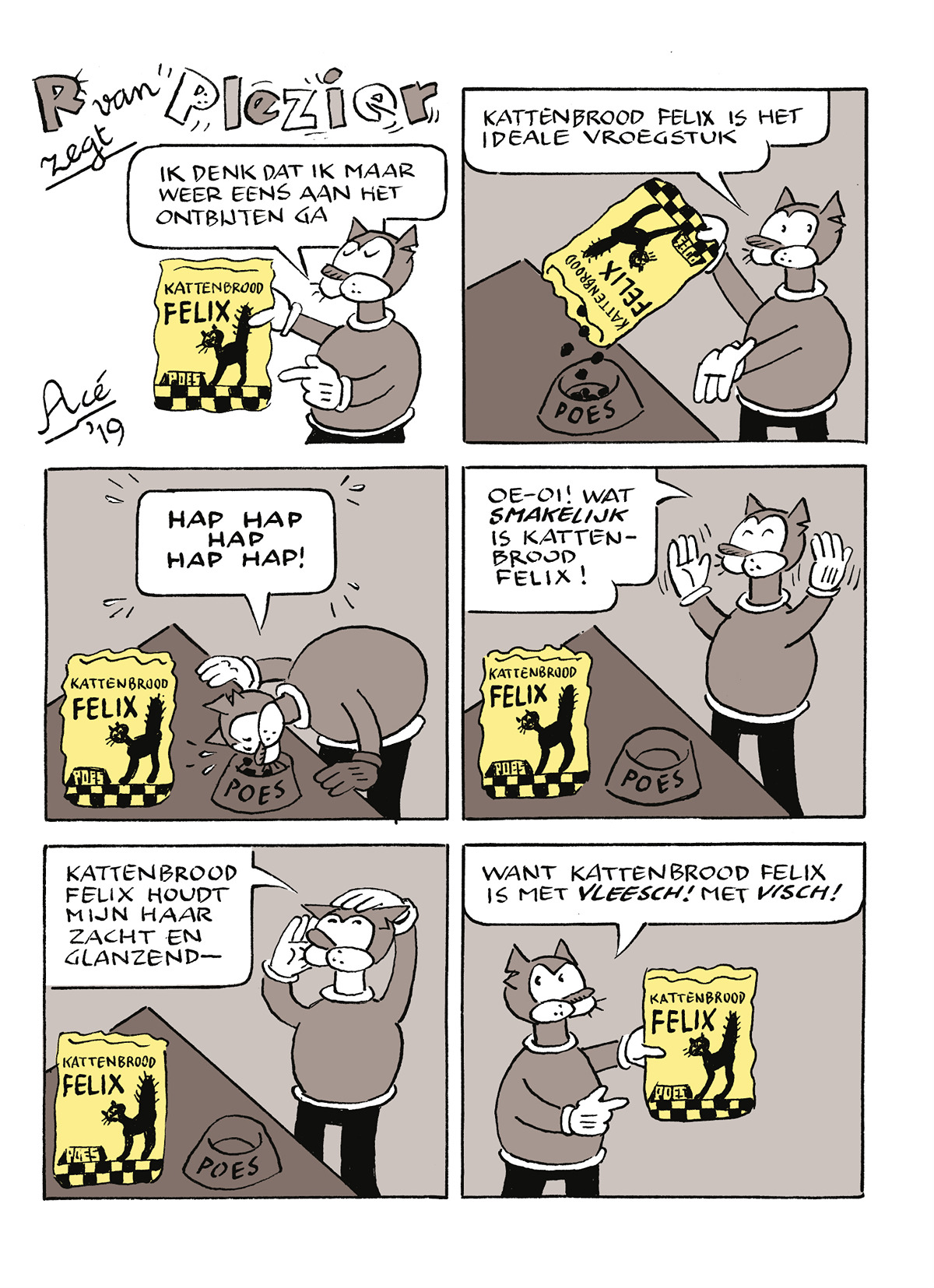 (7 februari 2020)In 2019 bestond het tekenfilmfiguurtje Felix the Cat 100 jaar. René Windig, Cyril Koopmeiners en Piet Schreuders stelden een speciaal nummer samen, bestaande uit 17 pagina’s Poezenkrant en 79 pagina’s over de geschiedenis van Felix. Strip ‘R. van Plezier’: Aart Clerkx. Medewerking: David Gerstein.