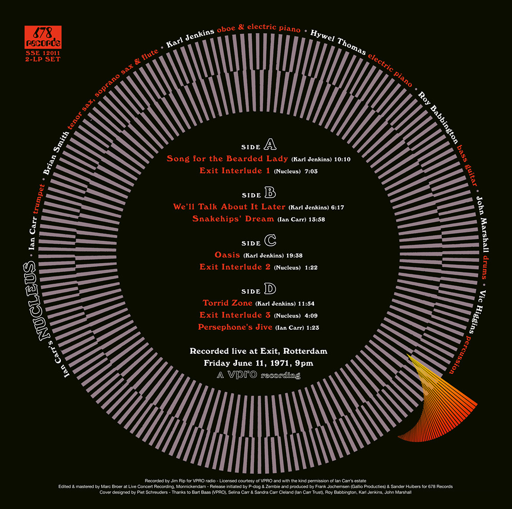 (17 februari 2020)LP-hoes (voor en achter) voor Ian Carr’s Nucleus (678 Records): ‘Amazing and unknown performance from legendary UK jazz prog fusion rockers Nucleus led by trumpet player Ian Carr’. Opname: 11 juni 1971 in Exit, Rotterdam, door VPRO radio. Geproduceerd door Frank Jochemsen voor Gallioproducties